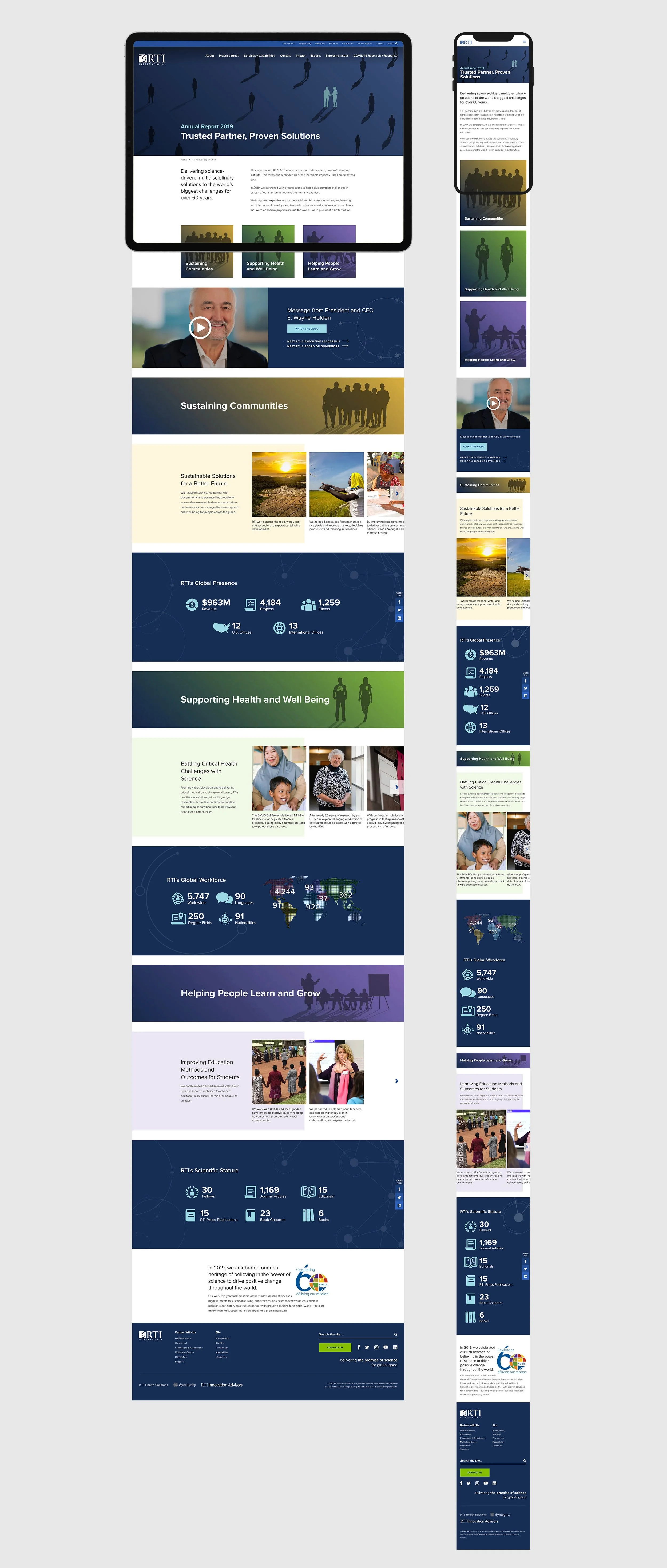 Designed an updated annual report experience for RTI International as part of the Corporate Communications design team, framing global work across disciplines into one consistent message.